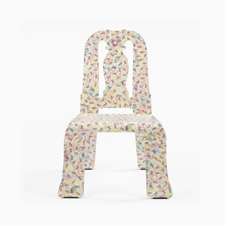 Robert Venturi is one of the chief theorists of Postmodernism. He famously countered Mies van der Rohe’s Modernist slogan “less is more” with “less is a bore.” Venturi and his wife together conceived of this Queen Anne, whose silhouette is inspired by an early-18th-century British chair. The design printed on the surface is the “Grandmother” pattern, consisting of two superimposed decorative schemes: a beloved tablecloth that belonged to a colleague’s grandmother, and black diagonal dashes, perhaps a quotation from Jasper Johns’s (b. 1930) paintings. Venturi and Scott Brown integrate a historical sensibility with modern materials and technologies. Wide and flat from the front, this chair is paradoxically thin in profile, like many of the mid-century modern pieces in this gallery, revealing the multiple layers that make up the plywood. According to the designers, the Queen Anne Chair is simultaneously modern and traditional, a witty commentary on breaking from the past while borrowing from it.