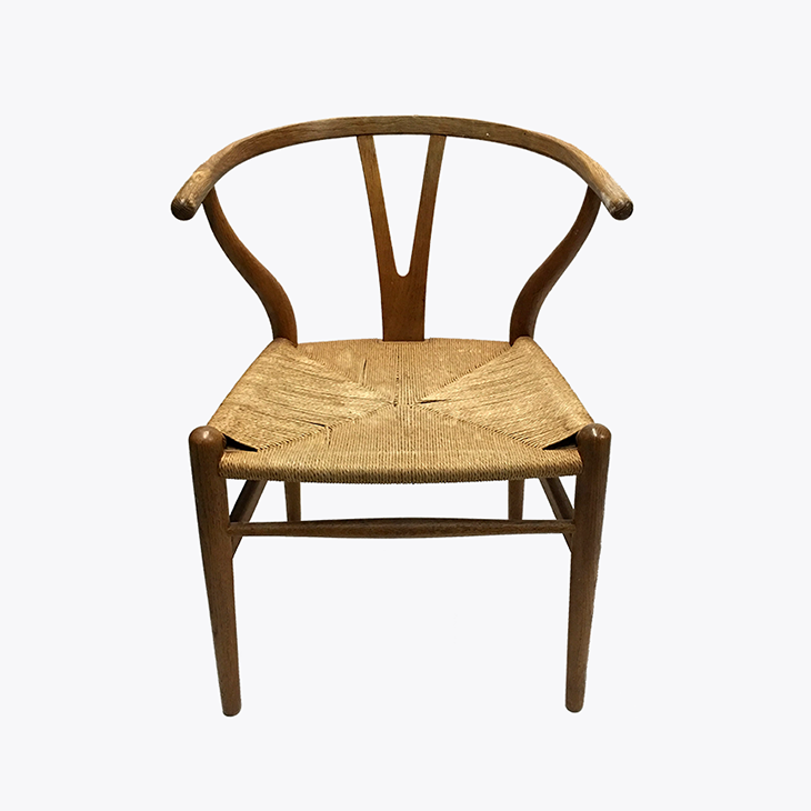 Light and sculptural, the Wishbone Chair is an unpretentious work composed of fourteen parts, but the straightforward design belies its hundred-step process of construction. The paper cord seat is still woven by hand today, resulting in a durable, yet comfortable support. The back legs are steam-bent into a tapering form to join the semi-circular top rail, whose single-piece holds both the back and the arms of the body. The distinctive shape of the back support is the source of this chair’s whimsical name. Also known as the Y-Chair or CH-24, Wegner found inspiration in Chinese Ming Dynasty chairs. The Wishbone is his most successful design and characteristic of the Danish Modern style.